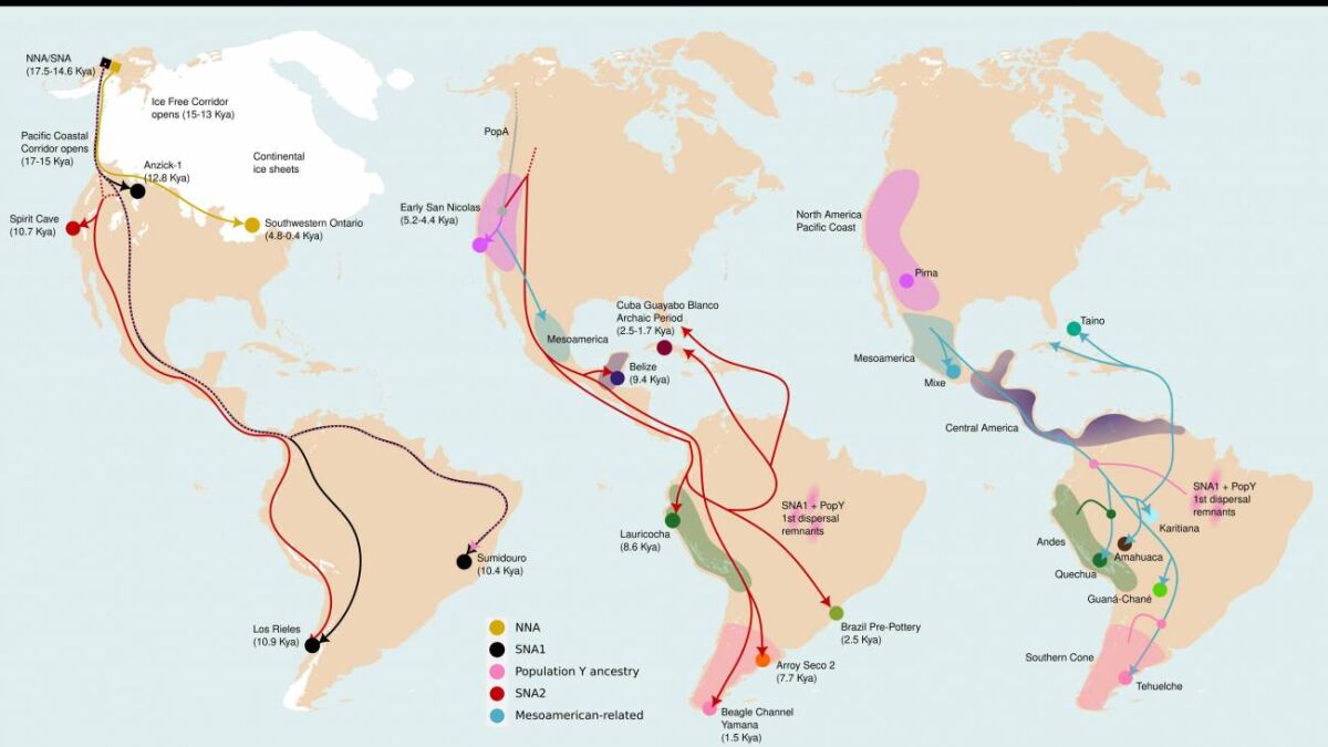 A excepción de algunas poblaciones, generalmente situadas en el Ártico, todos los indígenas americanos actuales descienden de una migración que ocurrió hace aproximadamente 15 000 años. La primera expansión ocurrió inmediatamente después de la entrada en Norteamérica. Hace alrededor de 9.000 años, se produjo una segunda oleada migratoria.