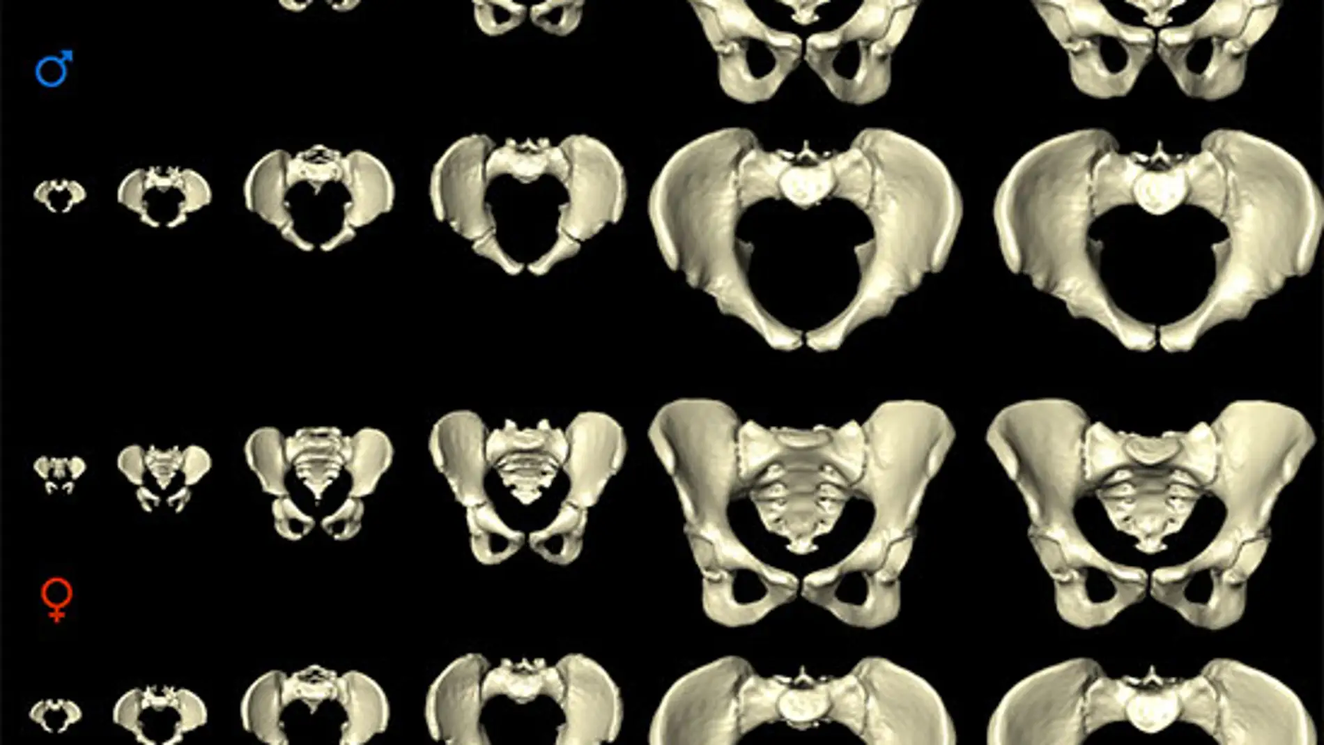 Mediante tomografía computarizada examinaron el desarrollo de la pelvis de 275 individuos con edades comprendidas desde el nacimiento hasta los 95 años de edad. Los resultados mostraron que, hasta el inicio de la pubertad, el desarrollo de la pelvis es paralelo en mujeres y hombres. A partir de ese punto, la pelvis femenina empieza a diferenciarse de la del hombre, ampliándose para facilitar el parto.