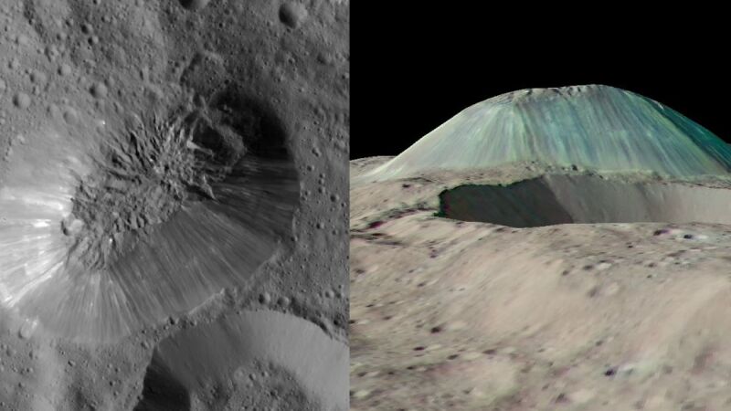 Científicos de la NASA creen que la montaña Ahuna Mons de Ceres es un criovolcán, un volcán extraterrestre de hielo y agua. El descubrimiento se presenta ahora junto a otros cinco estudios basados en los datos de la sonda espacial Dawn, en órbita en torno a este remoto planeta enano.