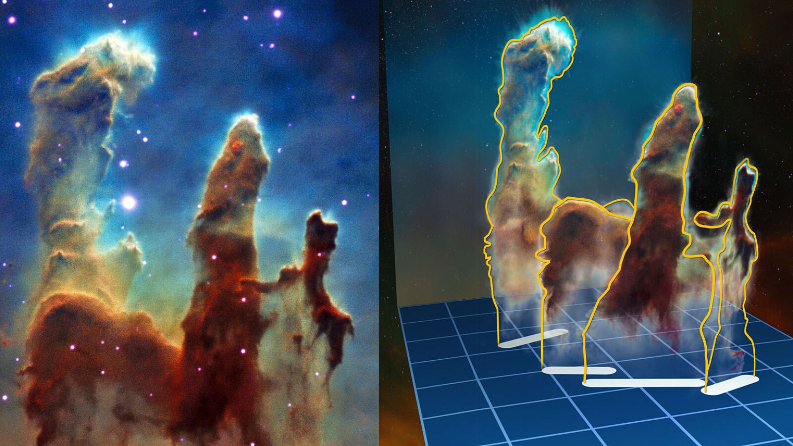 Hace dos décadas el telescopio espacial Hubble captó su famosa imagen de los Pilares de la Creación, colosales columnas polvorientas de la Nebulosa del Águila. Ahora los astrónomos han generado su imagen tridimensional gracias a un instrumento del Observatorio Europeo Austral, en Chile. Los nuevos estudios sugieren que sería más acertado apodar a estas icónicas estructuras como 'los pilares de la destrucción', ya que acabarán evaporándose en tres millones de años.