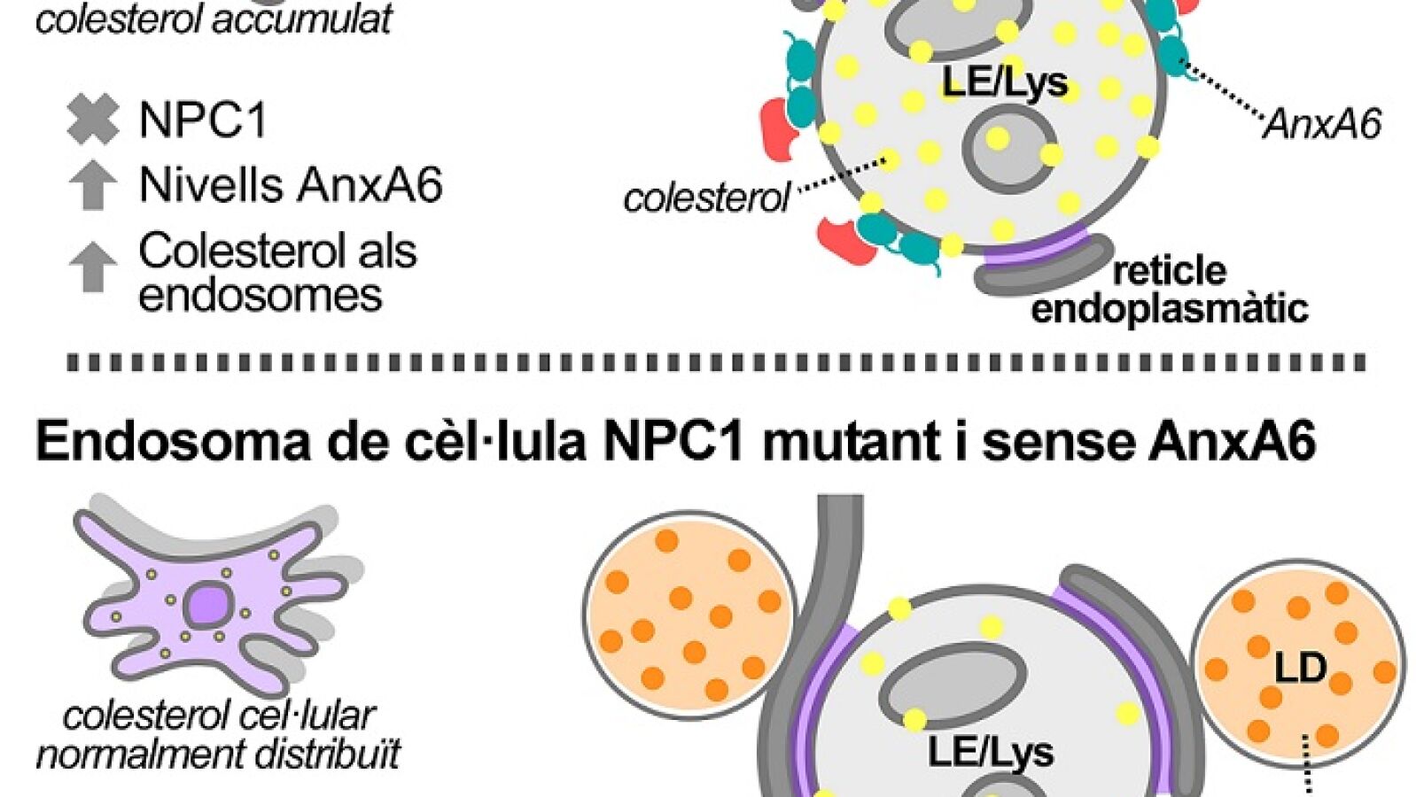 Una de estas enfermedades es la de Niemann-Pick de tipo C1, ocasionada por una mutación en el gen NPC1 que provoca la acumulación de colesterol en el interior celular, en unas vesículas llamadas endosomas. Se trata de una patología genética rara y sin cura que provoca daños hepáticos y, finalmente, un tipo de demencia.