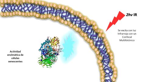 “Químicamente hablando, el sensor está compuesto por un fluoróforo unido a una galactosa. Las células senescentes tienen la propiedad diferencial de que rompen enlaces con galactosa muy eficientemente. Cuando el sensor se internaliza en una célula senescente se rompe este enlace y esto da lugar a un gran aumento en la fluorescencia del sensor que es la señal que detectamos excitando con un láser. Sin embargo, cuando el sensor se internaliza en una célula normal (no senescente) no se observa señal”, apunta Ramón Martínez Máñez, director del Instituto IDM-UPV y director científico del CIBER-BBN.