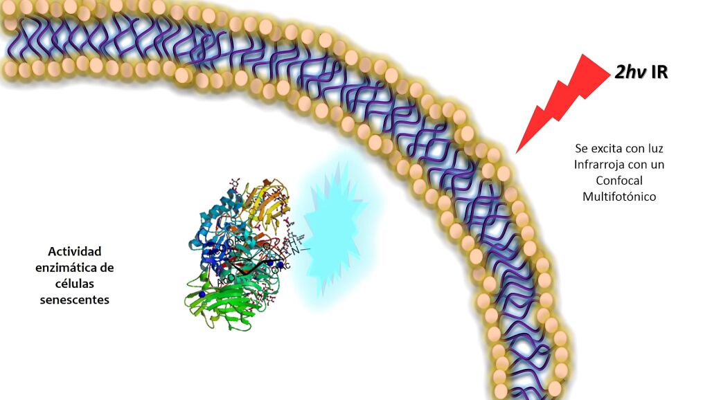 En concreto, los investigadores han desarrollado una nueva sonda capaz de detectar células senescentes en un modelo in vivo, algo que no se había logrado hasta ahora. “La sonda aumenta significativamente la fluorescencia de manera selectiva en el interior de las células senescentes”, comenta Beatriz Lozano, investigadora del Instituto Interuniversitario de Investigación de Reconocimiento Molecular y Desarrollo Tecnológico (IDM) en la UPV.