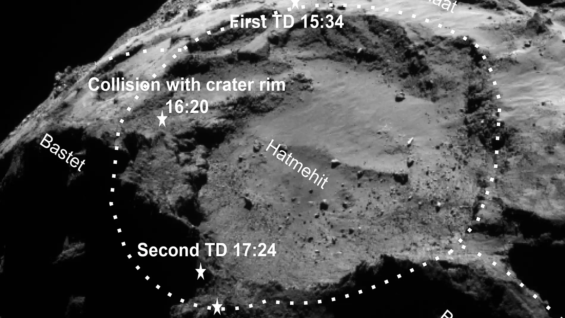 Por su parte, el artículo coordinado por Jens Biele del German Aerospace Center (DLR) en Alemania, describe los momentos críticos del descenso de Philae sobre el cometa, donde rebotó en la zona blanda en la que pretendía aterrizar y acabó asentándose en una zona alejada más dura. Los análisis de los distintos grados de resistencia a la compresión de las dos superficies, y donde las patas se anclaron de forma diferente, podrían ayudar a mejorar el diseño de futuras misiones a este tipo de objetos.