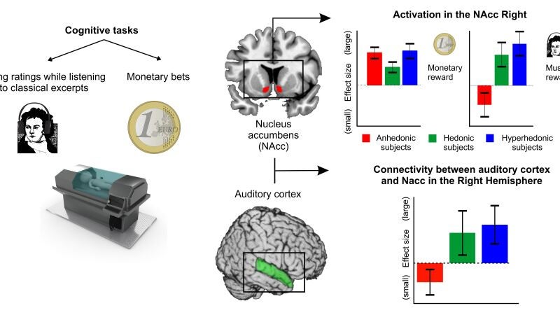 Los resultados mostraron que la disminución de respuesta placentera ante la música de los participantes con anhedonia musical está relacionada con una reducción en la actividad del núcleo accumbens, una estructura subcortical clave del sistema de recompensa.