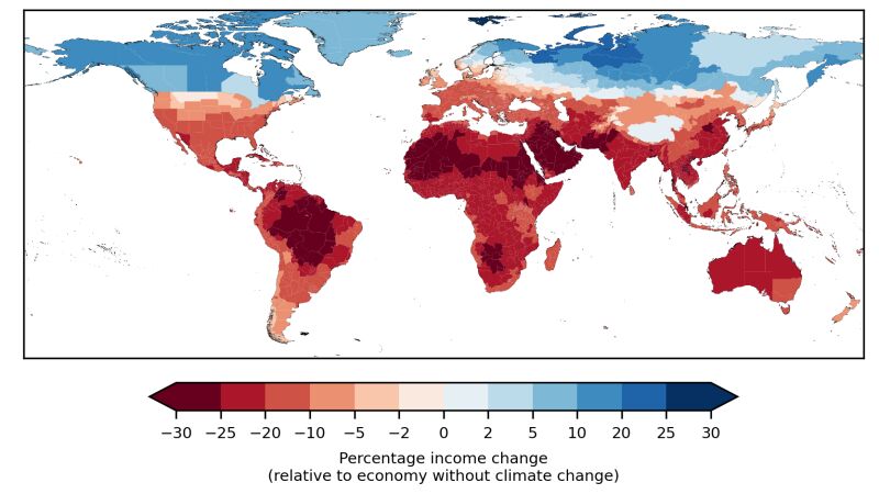 Se prevé que los países con menores ingresos y menores emisiones históricas sufrirán una pérdida de ingresos un 61% mayor que los países con mayores ingresos y un 40% por encima que los países con mayores emisiones, lo que sugiere que un mayor calentamiento exacerbará los efectos de la injusticia climática.