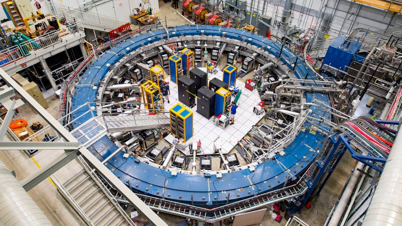 Los primeros resultados del experimento Muon g-2 de Fermilab confirman los realizados hace dos décadas en el Laboratorio Nacional de Brookhaven. Ambos muestran una fuerte evidencia de que los muones se apartan de la predicción del modelo estándar de la física de partículas. / Ryan Postel, colaboración Fermilab/Muon g-2