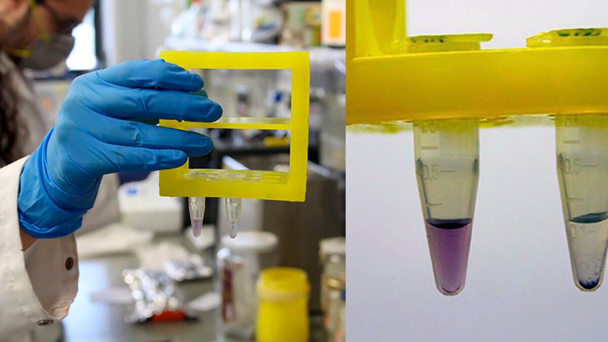 Cuando el ARN del coronavirus se une al ADN que llevan las nanopartículas de oro, se precipitan al fondo del vial y el color rojizo del líquido se torna transparente