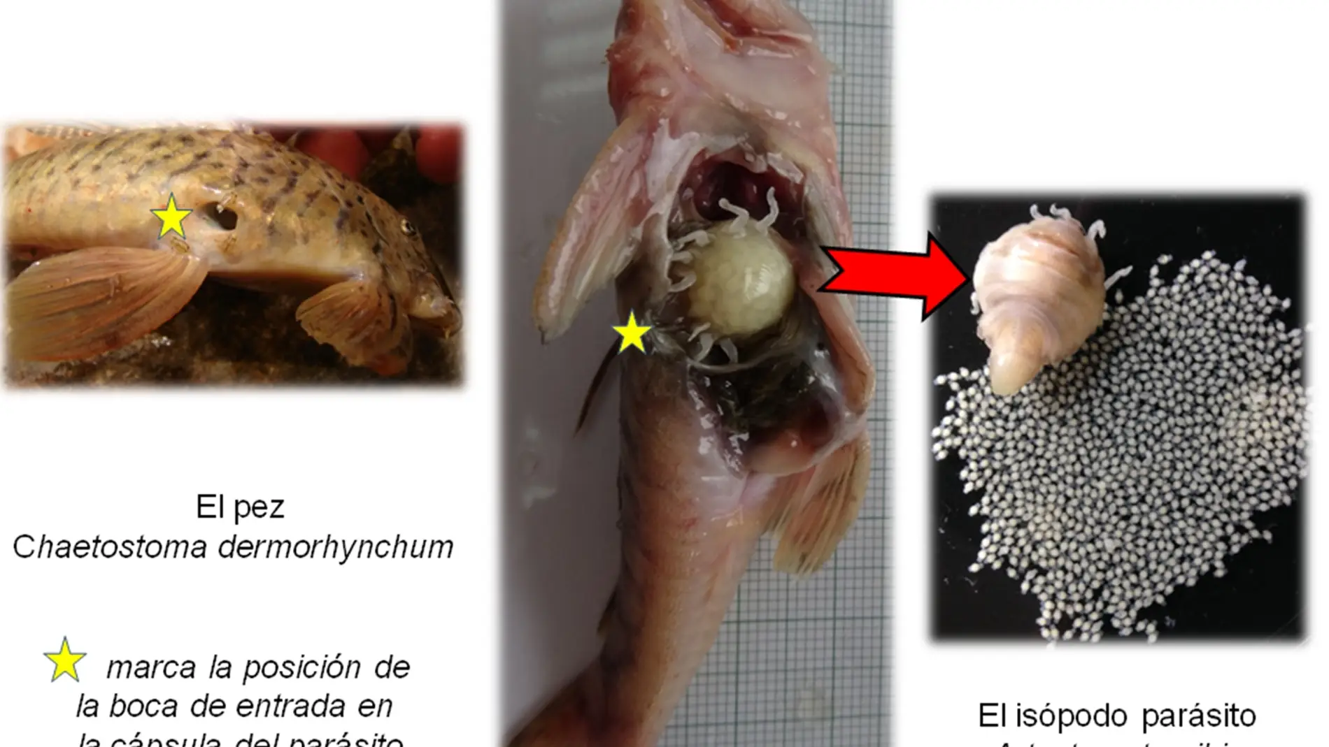 Algo parecido ha encontrado por primera vez Juan Junoy, profesor del departamento de Ciencias de la Vida de la Universidad de Alcalá, en los peces amazónicos de Ecuador y en la cuenca alta del Amazonas. En el río Tena, vive un crustáceo parásito que habita en la cavidad abdominal de un pez, la carachama (Chaetostoma dermorhynchum). Este parásito llega a representar más del 15% del cuerpo de su huésped. Si lo llevamos a nuestra escala, es como si viviéramos con un gato encerrado en la barriga.