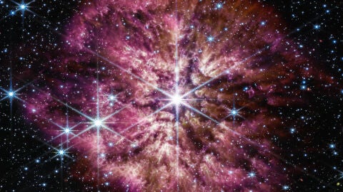 Una vista poco común de una estrella Wolf-Rayet —entre las estrellas más luminosas, masivas y más fugazmente detectables que se conozcan— fue una de las primeras observaciones realizadas por el telescopio espacial James Webb de la NASA, la Agencia Espacial Europea (ESA) y la agencia espacial canadiense, en junio de 2022. Con sus potentes instrumentos para ver el infrarrojo, los investigadores han logrado observar la estrella WR 124 con un detalle sin precedentes. El astro se encuentra a 15.000 años luz de distancia en la constelación de Sagitario.