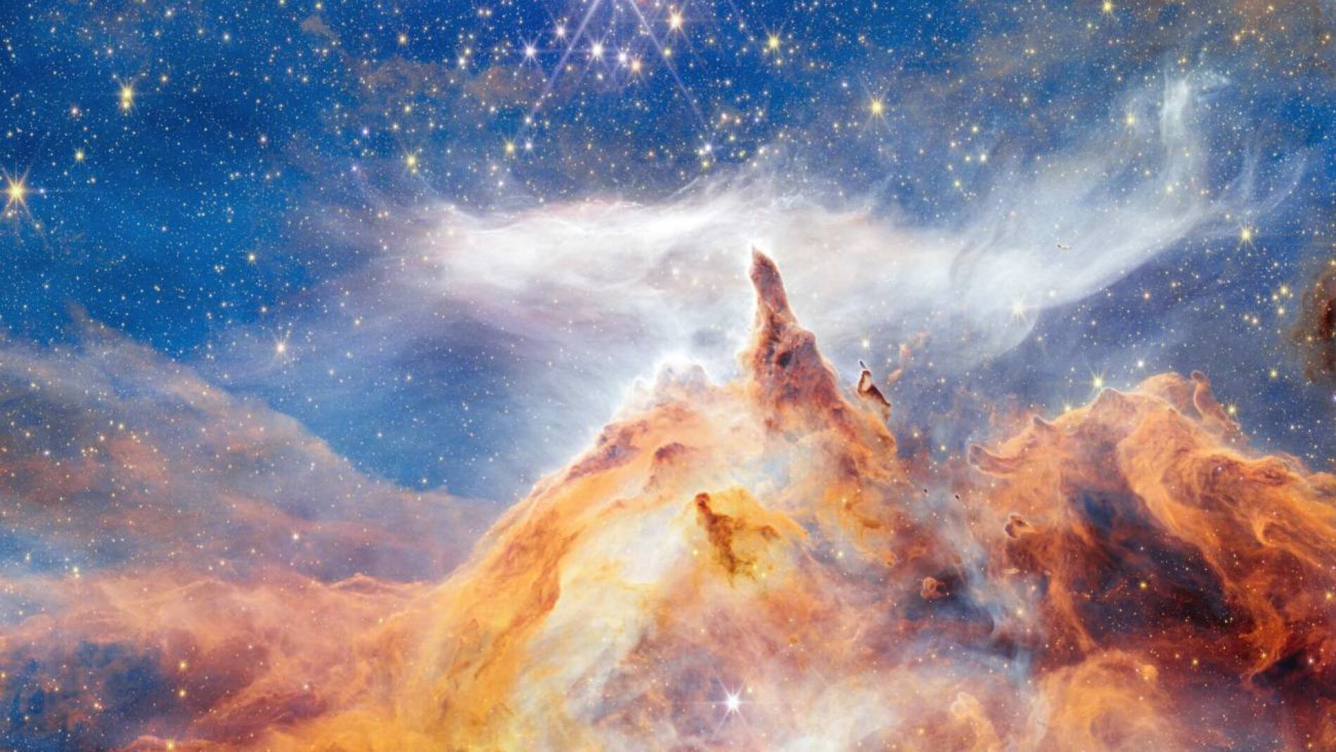 Las estrellas jóvenes y extremadamente calientes —algunas con temperaturas casi ocho veces superiores a la del Sol— emiten radiación abrasadora y vientos intensos que esculpen una cavidad en la pared de la nebulosa. Esta se extiende mucho más allá del campo de visión de NIRCam, aunque se aprecian pequeñas porciones en la parte inferior y superior derecha de la imagen. Chorros de gas ionizado fluyen desde las crestas de la nebulosa, mientras que velos de gas y polvo iluminados por la luz estelar flotan alrededor de sus picos. Agujas dramáticas sobresalen del muro de gas brillante, resistiendo la radiación y los vientos.