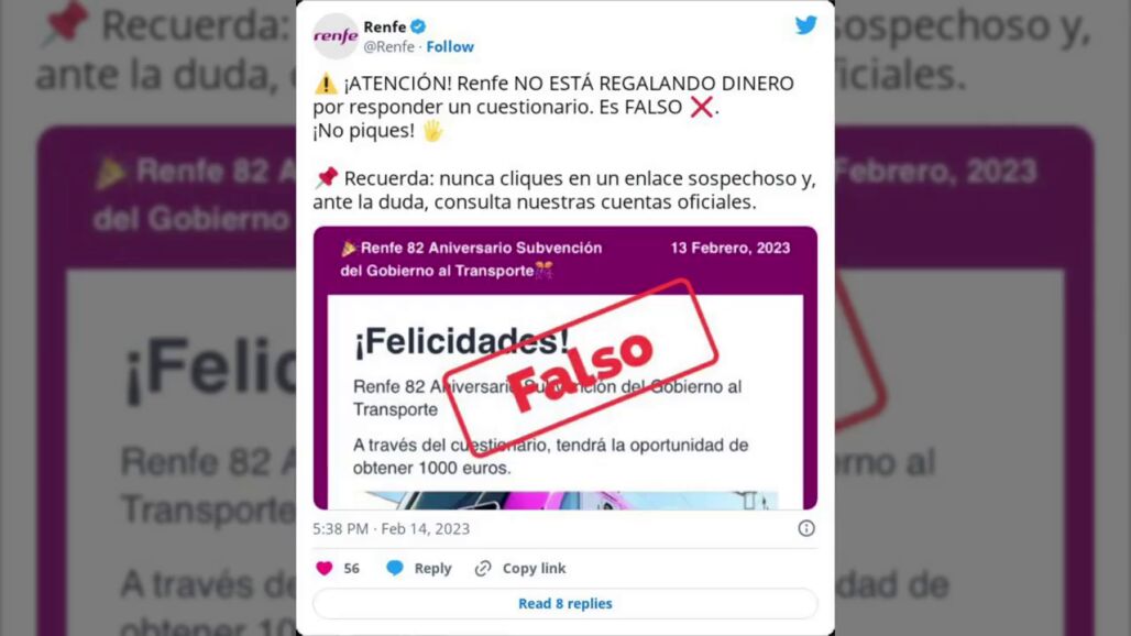 "Es FALSO. ¡No piques! Recuerda: nunca cliques en un enlace sospechoso y, ante la duda, consulta nuestras cuentas oficiales", dice en el mensaje que ha publicado la cuenta oficial de Renfe en Twitter.