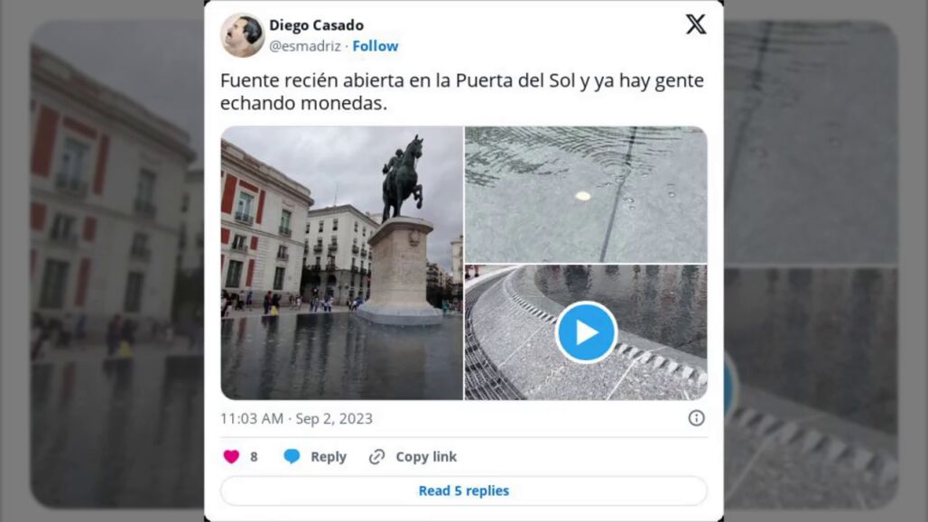 Sin embargo, una de las cosas que más ha llamado la atención de los tuiteros es que como si de la Fontana di Trevi de Roma se tratase, la gente ya está tirando monedas al interior de la fuente... ¿para pedir deseos? No sabemos exactamente cuál es la finalidad de esta acción (ya que en la ciudad italiana sí se trata de una tradición y tiene su significado) pero la imagen de las monedas en la nueva fuente de la Puerta del Sol no ha tardado en difundirse.