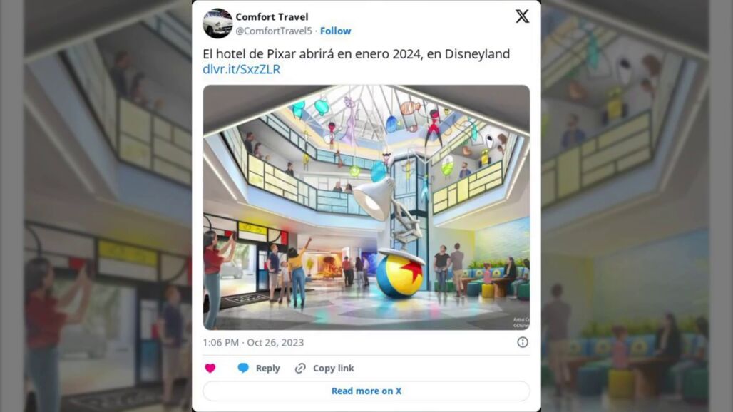 Tal y como ha anunciado la compañía, el Paradise Pier Hotel, ubicado en Disneyland Resort (California, EE.UU.), va a iniciar una transformación para convertirse en el primer hotel completamente temático de Pixar en Estados Unidos y abrirá sus puertas el 30 de enero de 2024.