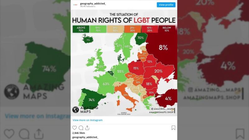 Tal y como podemos ver en el mapa, publicado por la cuenta de Instagram @geography_addicted_, España se sitúa en primer lugar en color verde oscuro con un 74% en cuanto a los derechos humanos de las personas LGTBI. Un dato, sin duda, que nos hace sentirnos orgullosos y que sabemos que merece la pena seguir luchando y trabajando por avanzar.
