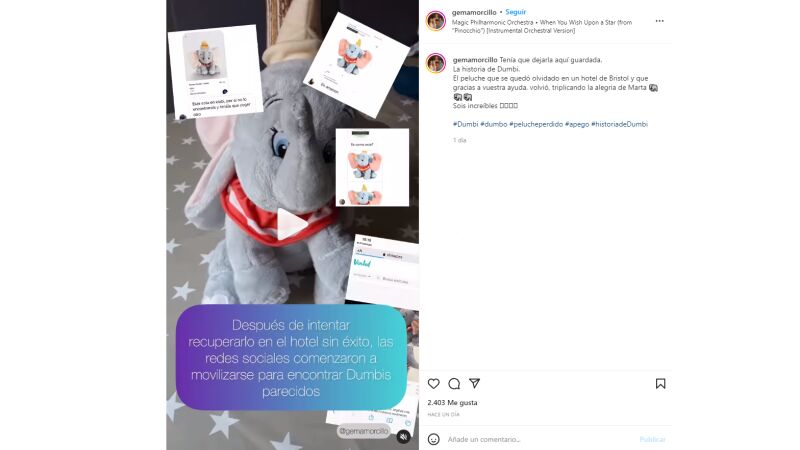 En un reel de Instagram, Gema contaba todos los detalles de lo sucedido desde que Dumbi se quedó en el hotel de Bristol y recopilaba cronológicamente todo lo acontecido en estas últimas semanas. Los innumerables mensajes recibidos tras publicar el vídeo permitieron dar con el mismo modelo de peluche de Dumbi.