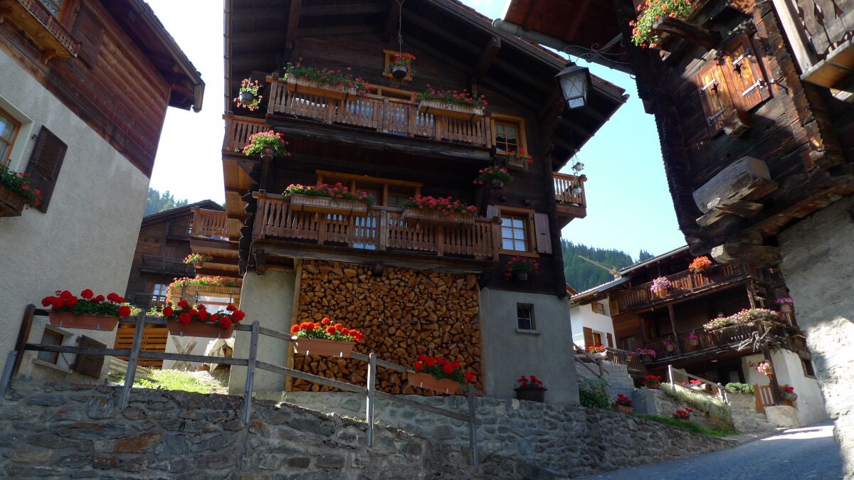 Un pueblo alpino donde el tiempo parece haberse detenido entre casas de madera centenarios, flores rojas y montañas que rozan los glaciares