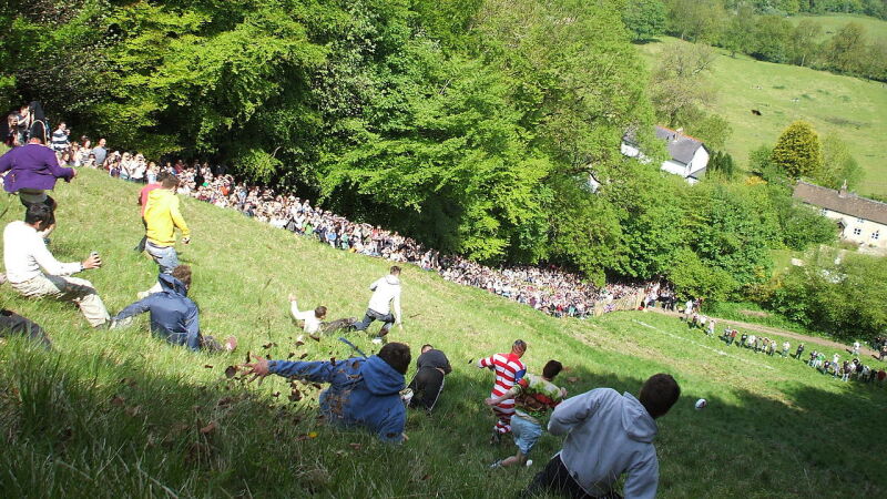 El último lunes de mayo los ingleses hacen rodar un queso colina abajo en las afueras de la localidad de Brockworth, en Gloucestershire; el asunto no pasaría de ahí si ese queso rodante no atrajera tras de sí a miles de personas que acaban rodando también colina abajo... una carrera tras la que los participantes cuentan moratones cuando no algún que otro hueso roto, sin ir más lejos el pasado años hubo un participante que se rompió una pierna.