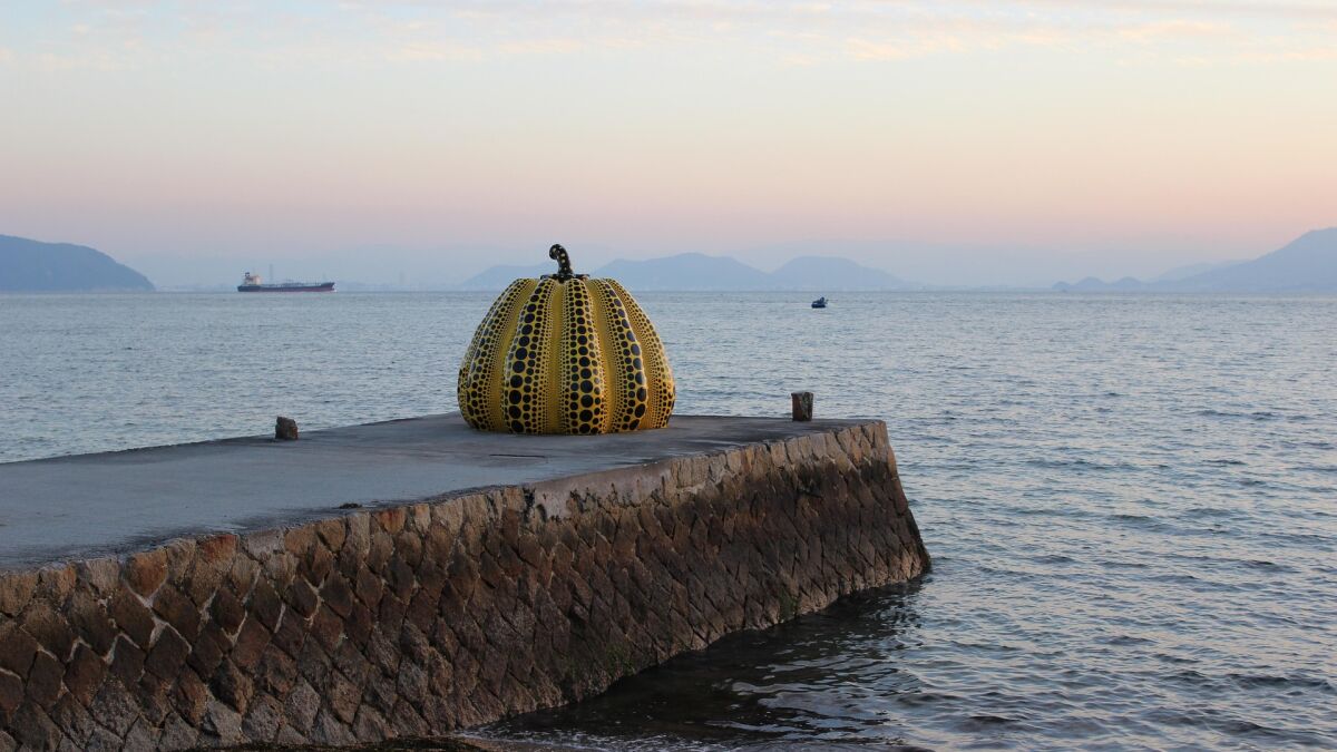 La arquitectura de Tadao Ando domina la isla (minimalista, de hormigón visto, líneas geométricas, uso dramático de la luz y absoluta integración en el paisaje) pero la imagen más característica y representativa de Naoshima no es suya sino de Yayoi Kusama y se trata de una calabaza amarilla gigante ubicada en el muelle.