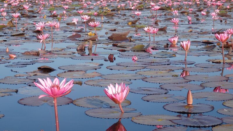 El rosa es el color que predomina en el horizonte de este lago que, a su vez, forma parte del lago Nong Han Kumphawapi, una masa de agua de cerca de 13.200 hectáreas de extensión. Por supuesto, para verlo al máximo de su potencial, lo mejor es visitarlo en la época de floración, entre noviembre y febrero.