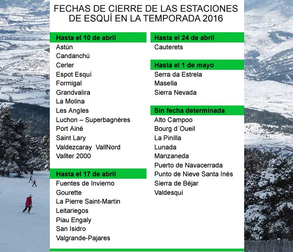 Los amantes de la nieve tendrán que darse prisa si quieren disfrutar de algún descenso más. La temporada 2016 llega a su fin en nuestro país en las próximas semanas, e incluso ya hay estaciones cerradas. Te damos las fechas clave que hay que apurar.