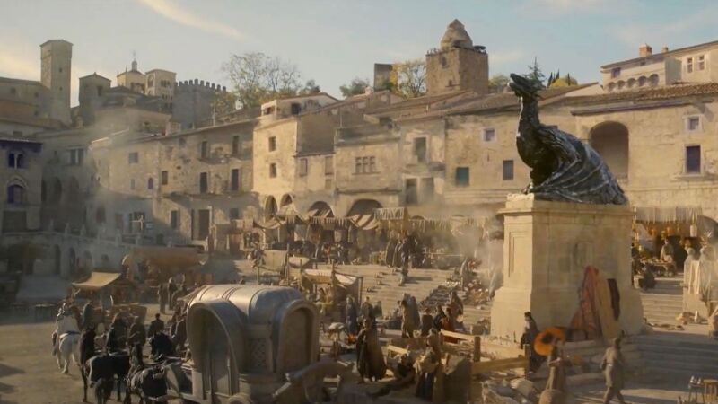 Al comienzo de La Casa del Dragón aparece un gran mercado en Desembarco del Rey, la capital de Poniente. Es, en la realidad, la Plaza Mayor del municipio cacereño de Trujillo.