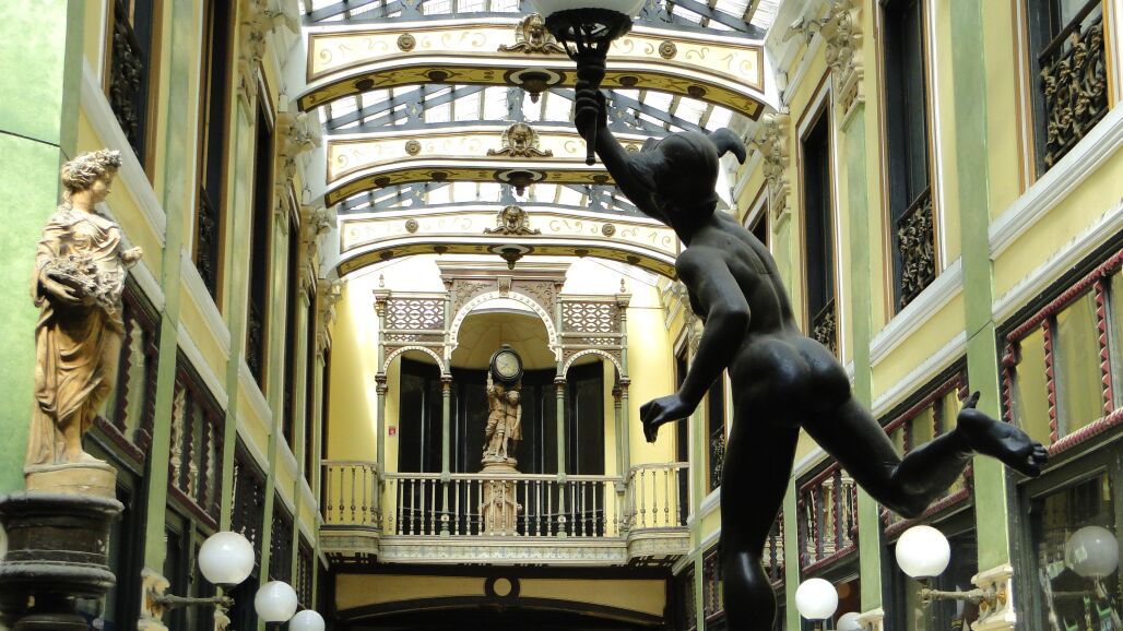 Una de las cuestiones a tener en cuenta es que esta galería está desarrollada en dos tramos perfectamente diferenciados. Éstos están enlazados por una rotonda bajo la cúpula de cristal que cuenta con una escultura similar al Mercurio de Juan de Bolonia. Una clara representación, precisamente, al dios del comercio.