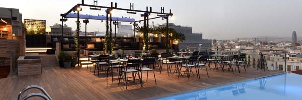 6. Sky Bar - Gran Hotel Central. Una pisicina que por las noches cambia de color es uno de los atractivos que distinguen al Sky Bar del Gran Hotel Central. Su carta es sencilla en cuanto a comidas, con varios tipos de sándwiches de autor, hummus, jamón... y es en la parte de bebidas donde hay muchísima variedad. No falta la tradicional coca de cristal con tomate. Via Laietana, 30.