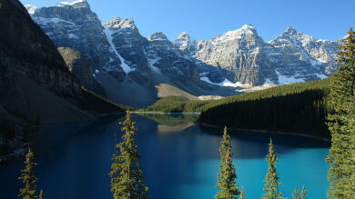 Un valle de montañas con más de 3 mil metros de altitud esta sobrecogedor como concepto. Pero si le sumas un lago como el Moraine, de aguas claras, cristalinas y azuladas y densos bosques de coníferas de un intenso verde oscuro, la foto es impresionante. Aunque lo más impresionante ante las dimensiones de los macizos de roca es nuestra propia dimensión relativa, la nuestra, ante semejante belleza y tamaño. Una especie de paraíso que está en las Rocosas de Canadá, en el Parque Nacional de Banff, Alberta.