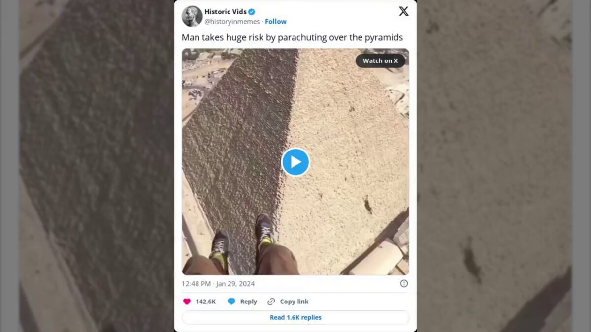 Un joven paracaidista ha corrido un gran riesgo sobrevolando las pirámides de Egipto y el vídeo se ha hecho viral en Twitter. Sin embargo, son muchas las personas que se están fijando en lo que se ve en la cima de una de ellas.