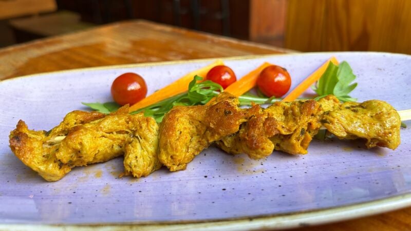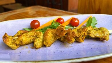 Descripción: Una versión del pincho moruno marroquí, elaborado a partir de seitán casero y aliñado con especias. Acompañado de una pequeña guarnición de crudités.